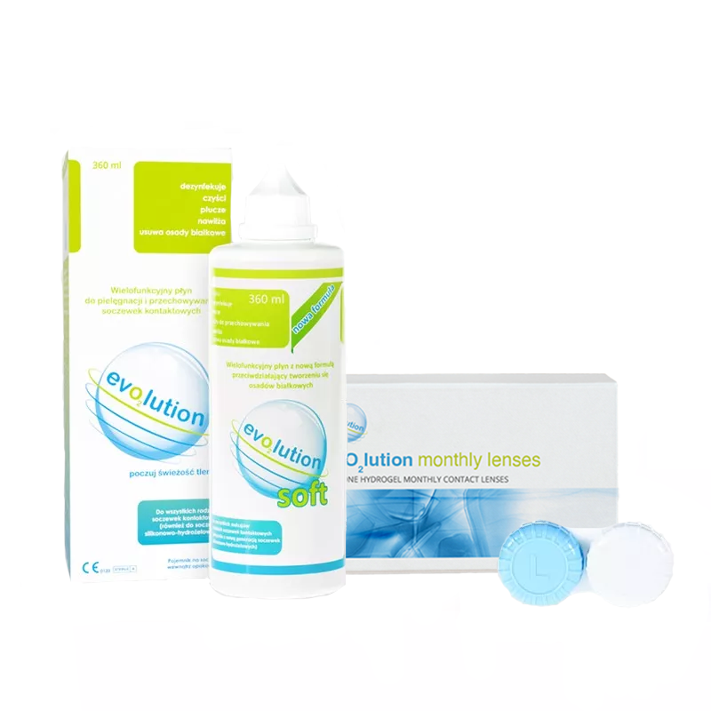 Silikonowo-hydrożelowe soczewki miesięczne evO2lution monthly lenses w zestawie promocyjnym z płynem pielęgnacyjnym oraz pojemnikiem do przechowywania soczewek.