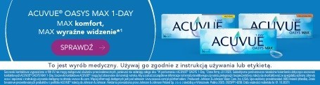 ACUVUE® OASYS MAX 1-Day to nowe jednodniowe soczewki kontaktowe od Johnson&Johnson, które zawierają dwie innowacyjne technologie: TearStable™, zapewniającą stabilizację filmu łzowego oraz filtr światła niebiesko-fioletowego OptiBlue™. Te zaawansowane rozwiązania pozwalają na osiągnięcie maksymalnego komfortu i nadzwyczajnej ostrości widzenia przez cały dzień.